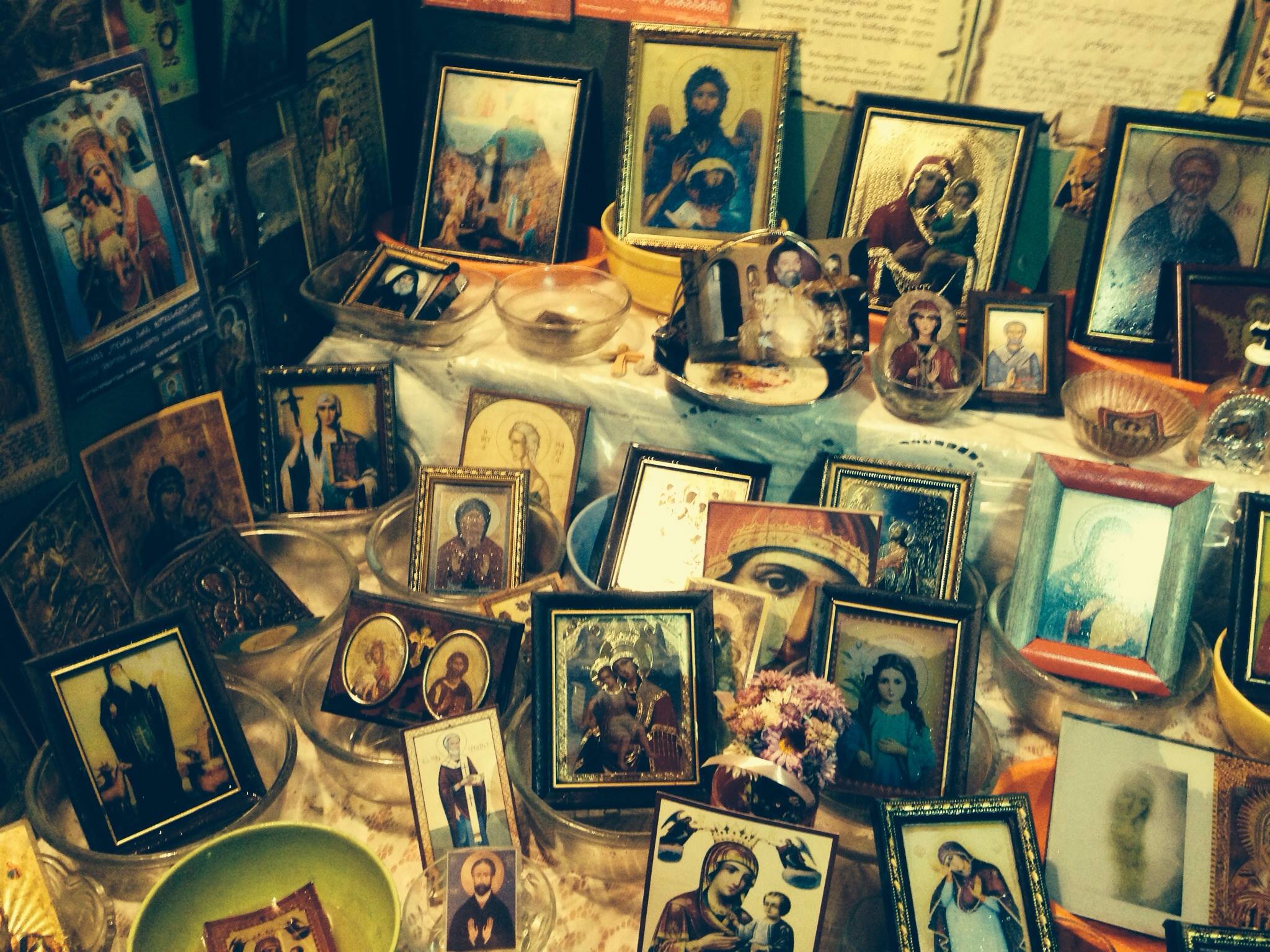 - კი, ხატები თასებშია ჩაბრძანებული, წვეთას რომ დაიწყებს, მირონი არ დაიკარგოს. ხატებთან მომლოცველები დაუჯდომლებს, სავედრებლებს აღავლენენ. მოდიან მოძღვრები და პარაკლისებს ატარებენ, - იყვნენ სამებიდან, ღვთაების მონასტრიდან, ძამას ხეობიდან, ფშავ-ხევსურეთიდან... მთელი დღის განმავლობაში აქ სულ რაღაც ხდება. რუსთავში ყველამ იცის ჩვენი მისამართი და ვისაც რა დროს უნდა, იმ დროს მოდის, დღეც და ღამეც. ზაფხულში ღამის 2-3 საათზეც მოსულან.