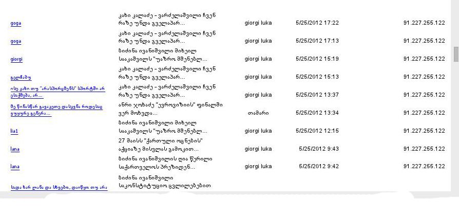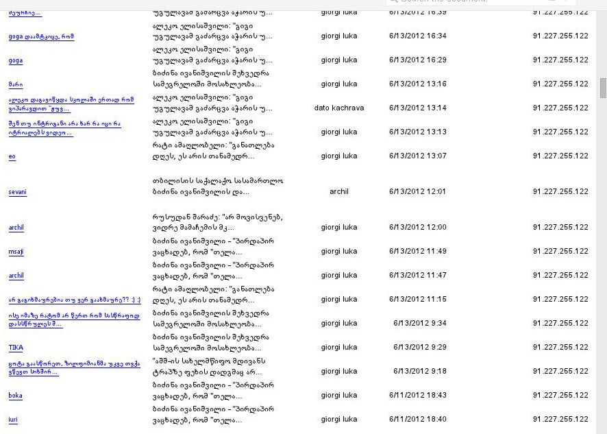 რა გასაკვირია, რომ ამ კომენტარის ავტორმა ან ავტორთა ჯგუფმა კარგად უწყის, რომ ხელისუფლებას გაუგონარი არაფერი რჩება და დღეს საყოველთაო მოსმენები ხორციელდება. IP-ი, საიდანაც ზემოთ ჩამოთვლილი ყველა კომენტარია შემოსული, შინაგან საქმეთა სამინისტროს ოპერატიულ-ტექნიკური დეპარტამენტის საინფორმაციო ტექნოლოგიებისა და ტელეკომუნიკაციების მთავარ სამმართველოს ეკუთვნის. სულ ამ IP-დან შემოსული 16 ნიკი დავითვალე. არადა, ზემოთ მოყვანილ კომენტარებში ისე ჩანს, თითქოს მგზავნელები ერთმანეთს ელაპარაკებიან. სინამდვილეში კი გამოდის, რომ ამ კომენტარების ავტორი ან საკუთარ თავს ელაპარაკება, ან ცდილობს შექმნას ილუზია, თითქოს რამდენიმე ადამიანი ერთი აზრისაა და ერთმანეთს ეთანხმება. ანტიპუტინისტი, დიონისე, ბრძენი, ლევან წერეთელი, სოხუმელი, კონსტანტინე, მზია, ფინანსისტი, ზიკო, ელეონორა, გია, პატარა ქართველი - ყველა ამ ნიკით შემოსული კომენტარი ერთი IP მისამართიდან (91.226.179.6) არის გამოგზავნილი, რომელიც მიხეილ გზირიშვილის სახელზეა რეგისტრირებული. მიხეილ გზირიშვილი კი საქართველოს შინაგან საქმეთა სამინისტროს ოპერატიულ-ტექნიკური დეპარტამენტის საინფორმაციო ტექნოლოგიებისა და ტელეკომუნიკაციების მთავარი სამმართველოს პირველი სამმართველოს უფროსის მოადგილეა.