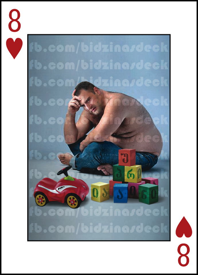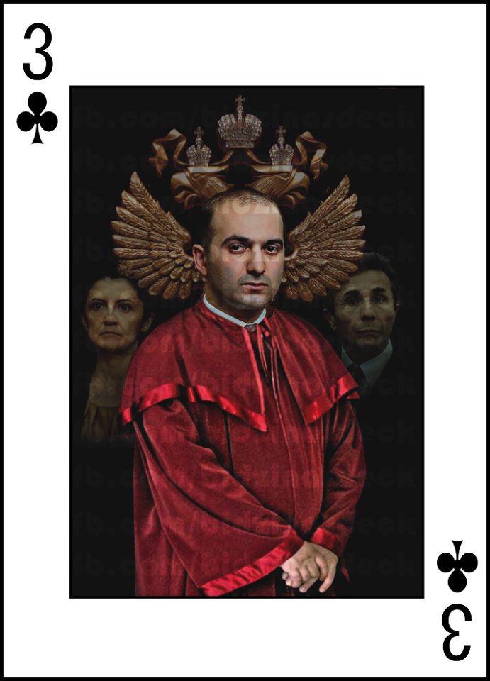 - ამ საკითხზე ვიდრე საბოლოოდ ჩამოვყალიბდებოდით, ბევრი ვიდავეთ. საბოლოოდ, მცირე კენჭისყრის მსგავსი ჩავატარეთ მასტების გამოსავლენად, რამაც შედეგი გამოიღო. თავიდანვე შევჯერდით მთავარზე: არავითარი პირადი ხასიათის მინიშნებები ან სექსუალური ნიშნის ფოტოკოლაჟი - ადამიანის უფლებების დაცვა ჩვენი პრიორიტეტია. ამიტომაც პერსონაჟების ფოტოკოლაჟში ვერ ნახავთ მინიშნებას პირად ცხოვრებაზე - გამონაკლისი მხოლოდ ნათესაური კავშირია. მაგალითად, ექსკლუზიურად გეტყვით, რომ ერთერთი ნახატის მიხედვით მეფეზე, გამოსახულია მამის ყელზე ჩამოკონწიალებული ქალიშვილი - ზრდასრულ ქალიშვილზე ვამბობ, რასაკვირველია. მგონი, ძნელი მისახვედრი არაა, ვინ იქნება ამ კარტზე. ხადურის ხსენებაზე ბევრს გაახსენდება ციკანი, ჰოდა, კარტზეც ციკანია, ზედაც - ჩანგალი პიჯაკის გარე ჯიბეში. რა შეიძლება გაგახსენდეს შიხიაშვილზე - ალბათ, ვირთხა. ჰოდა, ეგეც ადგილზეა...