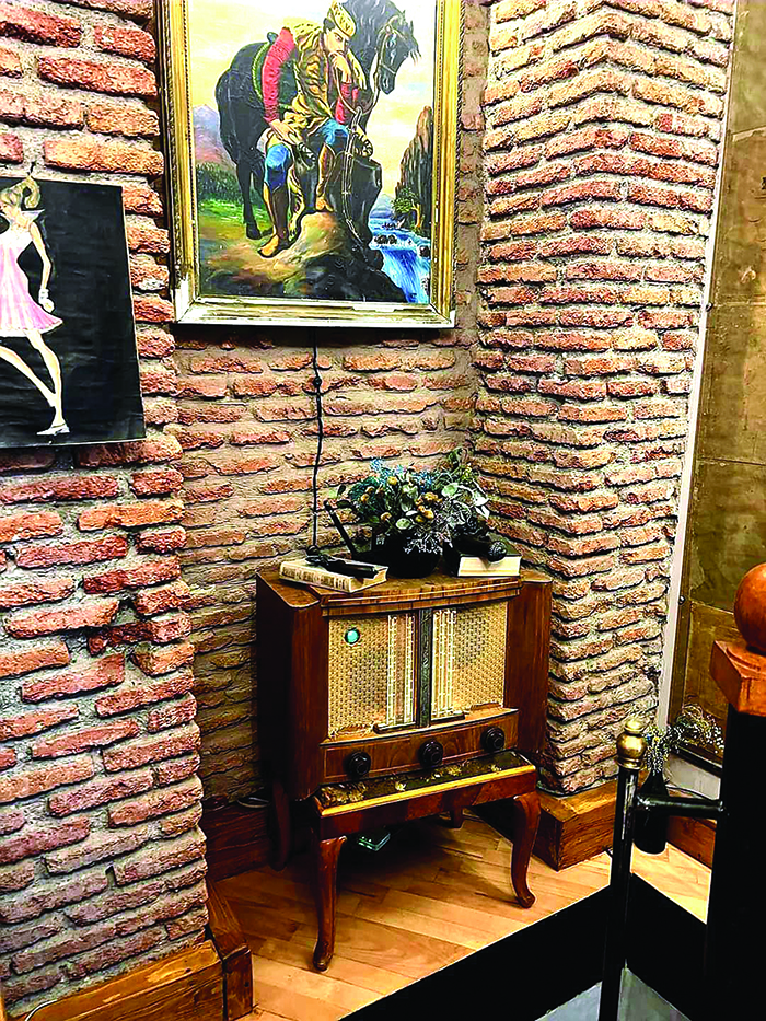 - 1954 წლის გამოშვებაა. როდესაც აქაურობის მოწყობა დავიწყეთ, უძველესი ნივთები მოვიძიეთ ახლობლებში. მაგალითად, ჩემი სიმამრი 90-იან წლებში ციხის უფროსი იყო და პატიმრებმა გაუკეთეს საჩუქრად ეს უნიკალური ჭაღები და შანდლები. ასევე გვაქვს XVIII საუკუნის, ერეკლეს პერიოდის ხმალი, XIX საუკუნის უნიკალური თოფი, რომელიც ჩემი მეგობრის სარდაფში ვიპოვეთ. აქ არის ასევე ორი წიგნი: ერთი ექვთიმე თაყაიშვილის ხელმოწერით, ხოლო მეორე - იოსებ იმედაშვილის ხელმოწერილი და 1929 წელს მისივე გამოცემული უცხო სიტყვათა ლექსიკონი.