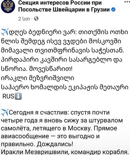 გუშინ მედიაში გავრცელდა ინფორმაცია, რომლის მიხედვით, Georgian Airways-ის მფრინავი, ირაკლი მეზვრიშვილი ამბობდა, რომ ბედნიერია, რადგან ისევ ჯდება მოსკოვისკენ მიმავალი თვითმფრინავის საჭესთან.