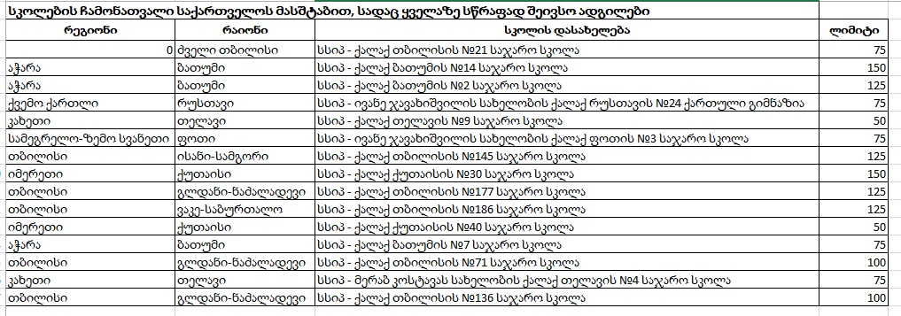 სკოლების ჩამონათვალი საქართველოს მასშტაბით, სადაც ყველაზე სწრაფად შეივსო ადგილები: