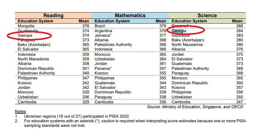 PISA 2022 წლის მონაცემებით, მოსწავლეთა 34%-მა მიაღწია მათემატიკის მე-2 საბაზო დონეს, რაც მნიშვნელოვნად ნაკლებია OECD-ის (ეკონომიკური თანამშრომლობისა და განვითარების ორგანიზაცია) ქვეყნების საშუალოზე (OECD-ის საშუალო: 69%). კითხვაში დაახლოებით 33%-მა მიაღწია კითხვის მე-2 ან უფრო მაღალ დონეს (OECD-ის საშუალო: 74%), ხოლო საბუნებისმეტყველო საგნებში დაახლოებით 35%-მა (OECD-ის საშუალო: 76%)“,- აღნიშნულია შეფასებისა და გამოცდების ეროვნული ცენტრის მიერ გავრცელებულ დოკუმენტში.