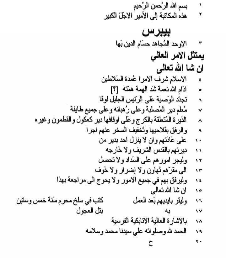 ესაა ბრძანება წინამძღოლისა, დიდებულისა, მეფეთა მშვენებისა, სულთანთა ბურჯისა, სარწმუნოების ზღუდისა... განსაახლებლად სიგელისა კეთილშობილ აბატ ლუკასი, წმინდა ჯვრის მონასტრის (dayr al Muşallaba) წინამძღოლისა. მის ბერებთან და საერთოდ, ქართველებთან დაკავშირებულ ყველა მონასტერს, იერუსალიმში თუ იერუსალიმის გარეთ, მათ მსახურებსაც კი... ყველას, ისე, რომ ერთიც არ დარჩეს, კეთილად მოექცნენ. მათი საცხოვრებლები დაცულ იქნეს ზიანისა და შიშისაგან. მოექცნენ თავაზიანად, ისე, რომ ზემოდან ამის შემოწმება კიდევ არ იყოს საჭირო. დიდება ალაჰს და კურთხევა მისი მუჰამადზე".