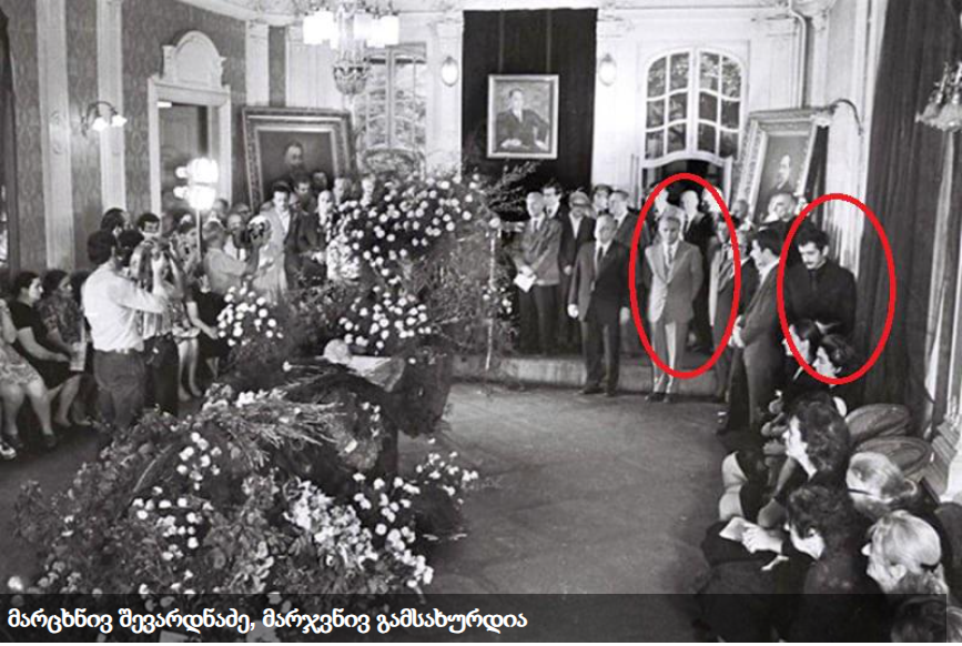 - ბატონო ჯემალ, ფოტოზე მარჯვენა კუთხეში, ჭირისუფალთა შორის დაფიქსირებულია კონსტანტინე გამსახურდიას ვაჟი - ზვიად გამსახურდია, მომავალში საქართველოს პირველი პრეზიდენტი, რომელიც იმ პერიოდში დისიდენტურ საქმიანობას ეწეოდა...თუ გახსოვთ, როგორ შეხვდნენ ედუარდ შევარდნაძე და ზვიად გამსახურდია ერთმანეთს?
