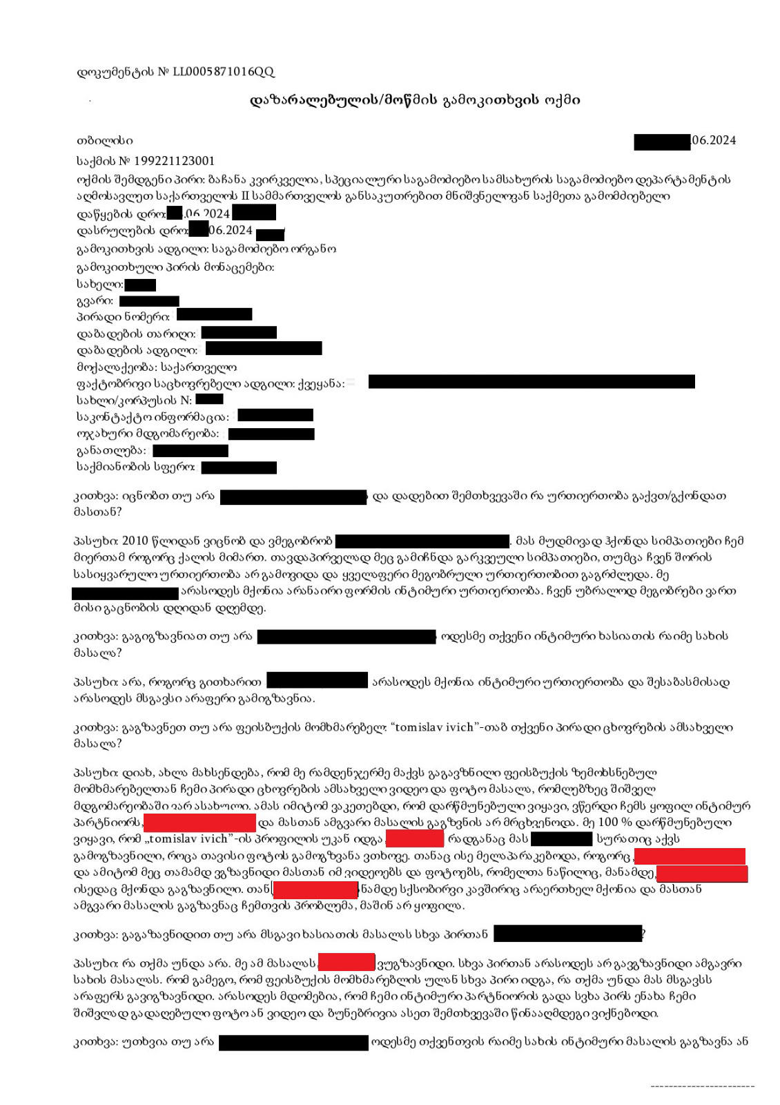 უწყების მიერ გავრცელებული განცხადების თანახმად, გამოძიებით დგინდება, რომ 2022 წლიდან, დაზარალებულ ქალბატონს ერთ-ერთ სოციალურ ქსელში ყალბი გვერდიდან უცნობი პირი წერდა, რომელმაც დაარწმუნა, რომ მისი ნაცნობი იყო, რომელთანაც წარსულში ინტიმური ურთიერთობა ჰქონდა. კომუნიკაციისას, უცნობი პირი დაზარალებულს პირადი ცხოვრების ამსახველი ინტიმური შინაარსის მასალის გადაგზავნას სთხოვდა, ხოლო მოგვიანებით, როდესაც დაზარალებულმა გაგზავნილი ინტიმური შინაარსის ფოტოების და ვიდეოების წაშლა მოსთხოვა, პირმა წაშლის სანაცვლოდ შეხვედრა და ინტიმური კავშირის დამყარება შესთავაზა.