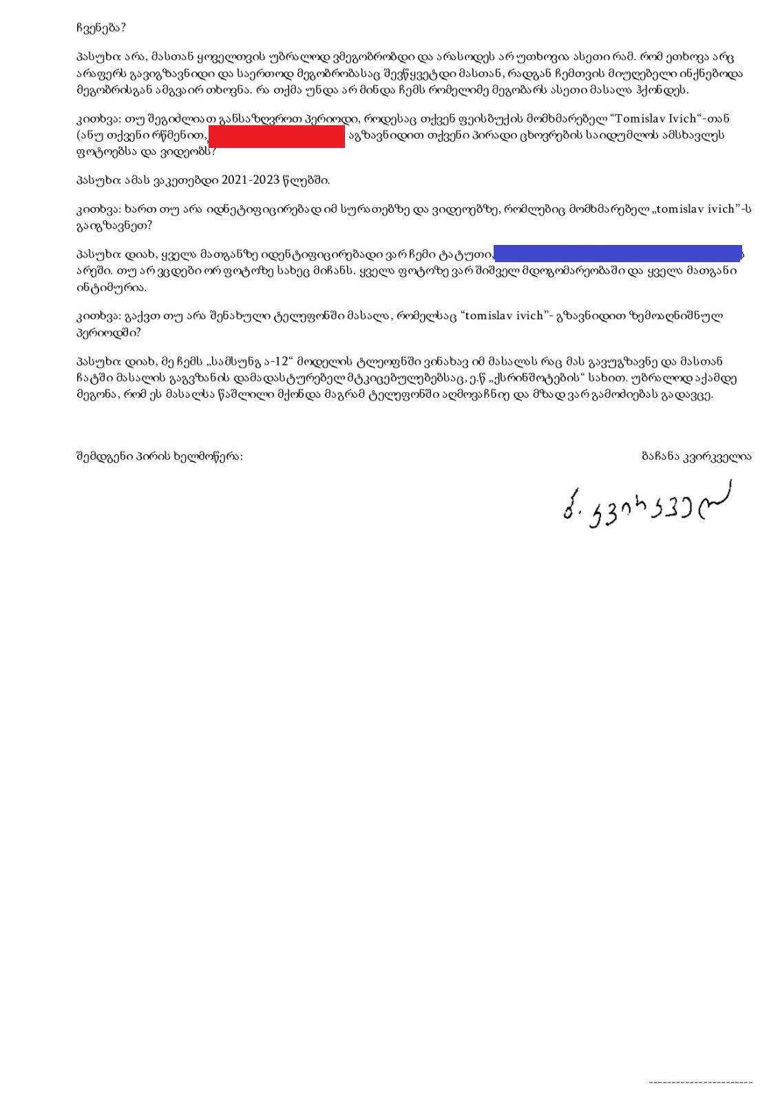 “საქმეზე მოპოვებული მტკიცებულებებით, მათ შორის, დაზარალებულის მიერ სხვადასხვა დროს გამოკითხვისას მოწოდებული ინფორმაციითა და META-დან მიღებული მასალებით დადგინდა მისამართები, რომლებზეც რეგისტრირებული ყალბი პროფილები ა.ც.-ის საცხოვრებელ და სამუშაო ადგილის მისამართებს ემთხვევა.