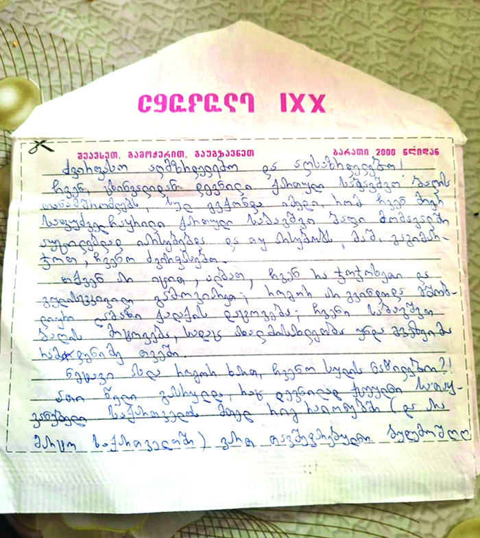 ძალიან ავფორიაქდი, მეგონა, დედაჩემთან შესახვედრად ვემზადებოდი. ვეღარ მოვითმინე და წერილის გამოსატანად წავედი. გზავნილი რომ გადმომცეს, უნებურად გულთან მივიდე. ძალიან ავღელდი, ოღონდ ვეცადე არ შემტყობოდა... წერილი რომ მომქონდა, საკმაო მანძილი ისე გამოვიარე, რომ ვერ ვხსნიდი. მერე რაღაც ბარი შემომხვდა, მაგიდები იყო და ჩამოვჯექი. წერილს რამდენჯერმე დავხედე, უცებ გავხსენი და წავიკითხე. ისეთი შეგრძნება მქონდა, რომ დედა მესაუბრებოდა. ჩვენ ახლა ცხინვალისგან ისევ შორს ვცხოვრობთ, ის ბაღიც აღარ არსებობს, მაგრამ არის დედას ეს წერილი:
