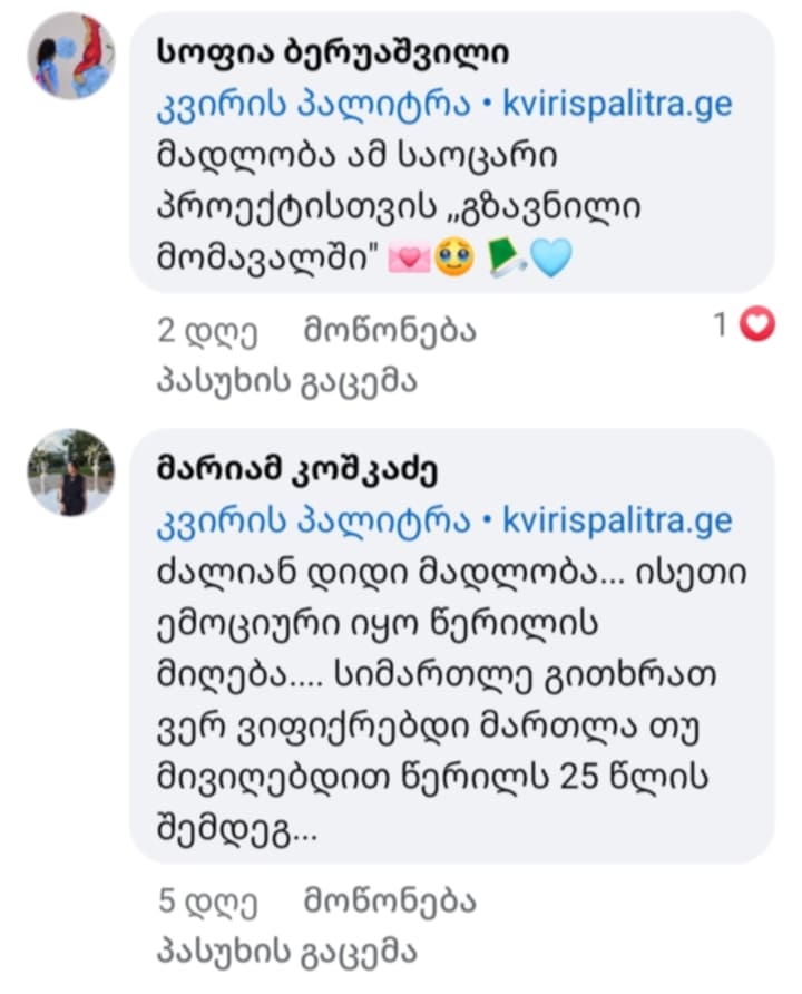 „წერილი ბებიისგან მივიღე. ძალიან განვიცადე... მადლობა, „კვირის პალიტრას“... მეც მინდა, რომ მქონდეს მსგავსი შესაძლებლობა, წერილი საყვარელ ადამიანებს მივწერო“.