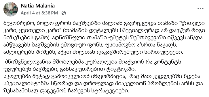 "მეგობრებო, ბოლო დროს ბავშვებში ძალიან გავრცელდა თამაში "წითელი კარი, ყვითელი კარი" (თამაშის დეტალებს სპეციალურად არ დავწერ რიგი მიზეზების გამო). აღნიშნული თამაში უმეტეს შემთხვევაში იწვევს ან/და ამწვავებს ბავშვების ემოციურ ფონს, უსიამოვნო აზრთა ნაკადს, აძლიერებს შიშებს, აქვთ ძილთან დაკავშირებული სირთულეები.