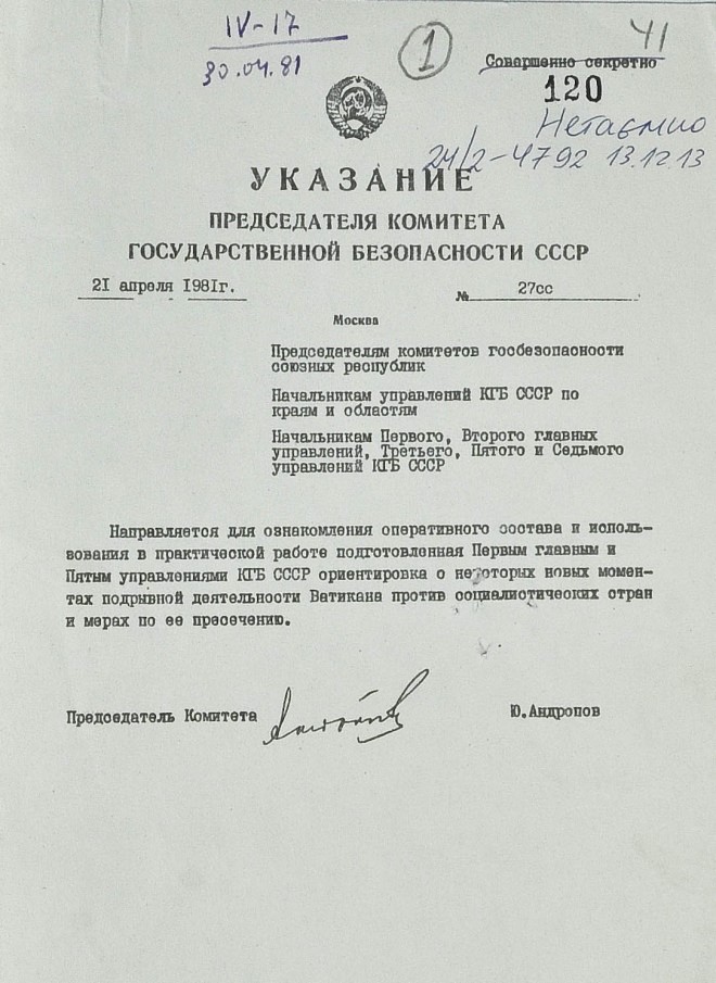 1981 წლის 21 აპრილს კა-გე-ბეს თავმჯდომარე იური ანდროპოვის ხელმოწერით მოკავშირე რესპუბლიკების სუკ-ის თავმჯდომარეებსა და სხვა ტერიტორიული ორგანოების ხელმძღვანელებს დაეგზავნათ „სრულიად საიდუმლო“ მითითება ვატიკანის „ძირგამომთხრელი საქმიანობის“ შესახებ.