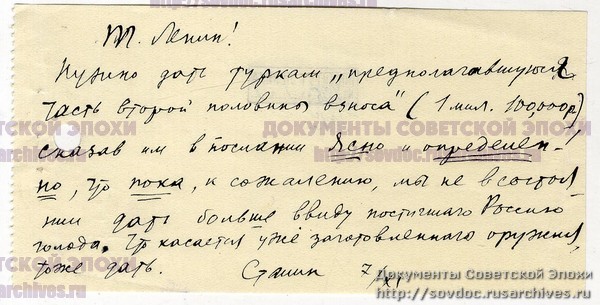ჩანს, რომ საქართველოს ტერიტორიის ერთობლივი დანაწილების შემდეგ თურქები ბოლშევიკებისგან შეპირებულ ფულსა და იარაღს დაჟინებით ითხოვდნენ: "ამხ. ლენინ! თურქებს საჭიროა, მივცეთ გათვალისწინებული ფინანსების მეორე ნაწილიც (1 100 000 რუბლი), ამავე დროს ნათლად და გარკვევით ავუხსნათ მათ, რომ ჯერჯერობით, სამწუხაროდ, არ შეგვიძლია მეტის მიცემა, რუსეთში დაწყებული შიმშილის გამო, რაც შეეხება მათთვის გამზადებულ იარაღს, ისიც მივცეთ. სტალინი. 7/11.21".