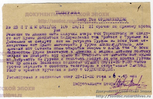 1920 წლის 22 ნოემბერს სტალინი საიდუმლო დეპეშას უგზავნის ბოლშევიკური რუსეთის საგარეო საქმეთა სახალხო კომისარ გ. ჩიჩერინს, ხოლო ასლს - ვლადიმერ ლენინს: "ჩიჩერინს, ასლი ლენინს თქვენი #9056 დეპეშის პასუხად: ბურჟუაზიულ საქართველოს დახმარება უნდა არა ანტანტის, არამედ - თურქეთის წინააღმდეგ, თუ ანტანტა ბათუმს დაიკავებს იმისთვის, რომ დაეხმაროს საქართველოს. ლოზუნგი "საქართველოსთვის" ნიშნავს თურქეთის წინააღმდეგ კომბინაციებს, რასაც უეჭველია, ცდილობს ანტანტა, რათა ჩვენ დაგვაპირისპიროს თურქეთთან. აი, რას მატყობინებს ჰუსეინოვი (გასაბჭოებული აზერბაიჯანის მეთაური - ბ.ა.): "საქართველოში ამჟამად დიდი შეშფოთებაა თურქების შემოტევის გამო. ჟორდანიამ გულახდილად გვითხრა მე და შეიმანს (შეიმანი - ბოლშევიკური რუსეთის წარმომადგენელი საქართველოში - ბ.ა.), რომ ინგლისმა სომხეთი გაყიდა და იმავეს გაიმეორებს საქართველოშიცო... ამასთან, თურქეთთან ომი პოპულარულია საქართველოში, რასაც ვერ ვიტყვით ანტანტასთან ომზე. ჩემი აზრით, ერთ-ერთი საუკეთესო კომბინაციაა თურქეთის წარმატებული ომი საქართველოსთან, რაც საშუალებას მისცემს რუსეთს, ჩაერიოს, როგორც შუამავალი და გადამრჩენი... სტალინი".