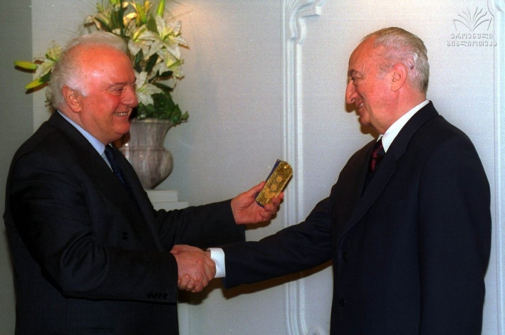 ედ. შევარდნაძე გენერალ-ლეიტენანტის სამხრეებს გადასცემს ნ. საჯაიას. 2001 წლის დეკემბერი.