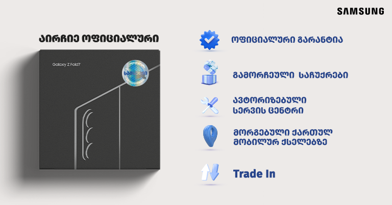 სამსუნგი სმარტფონებითა და სმარტ მოწყობილობებით მსოფლიოს სხვადასხვა რეგიონს ამარაგებს, სადაც განსხვავებული ელექტრონული და მობილური ქსელი თუ სტანდარტებია. თუმცა, საქართველოში Samsung-ის ოფიციალური ჰოლოგრამიანი სმარტფონები ადაპტირებულია ადგილობრივი ბაზრისთვის, კერძოდ შემოწმებულია და სრულად თავსებადია საქართველოში არსებული მობილური ოპერატორების ქსელებთან. თქვენ აღარ დაგჭირდებათ გაურკვეველი წარმომავლობის დამტენების ან გადამყვანების შეძენა სმარტფონის დასამუხტად. ასევე, არ მოგიწევთ სხვა ქვეყნებისთვის განკუთვნილი აპლიკაციებისგან შიდა მეხსიერების გასუფთავება. სამსუნგის ოფიციალური ჰოლოგრამით სმარტფონის შეძენისას, თქვენ გარანტირებულად ახალ და ორიგინალ პროდუქტს ყიდულობთ.