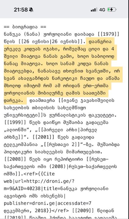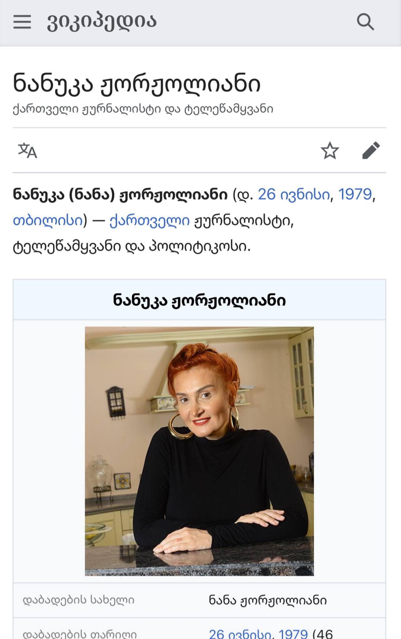 ტელეწამყვანი ნანუკა ჟორჟოლიანი "ფეისბუქზე" წერს, რომ მის შესახებ ქართულ ვიკიპედიაში გამოქვეყნებულ ცნობებში ცვლილებებია შეტანილი: