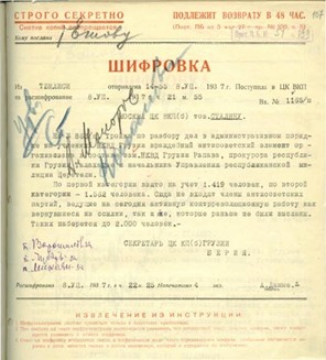1937 წლის 22 სექტემბერს საბჭოთა შინსახკომის ხელმძღვანელი, ნიკოლაი ეჟოვი შემდეგი შინაარსის სრულიად საიდუმლო დაშიფრულ დეპეშას გზავნის სტალინის სახელზე.