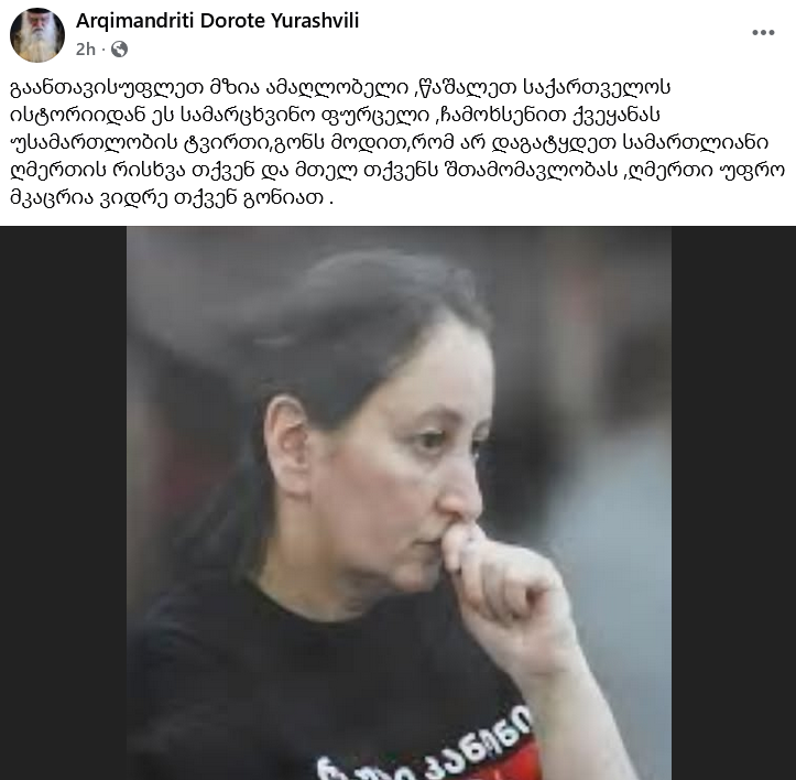 არქიმანდრიტი დოროთე ყურაშვილი მზია ამაღლობელთან დაკავშირებით, სოციალურ ქსელში პოსტს აქვეყნებს:
