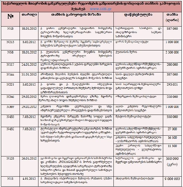 2012 წლის დასაწყისში კახეთის რეგიონალური განვითარების სააგენტოს გამოეყო 1 მლნ ლარი და კახეთის რწმუნებულის - გუბერნატორის ადმინისტრაციას დაევალა, ყოველ მუნიციპალიტეტში ჩატარებული სამუშაოების ანგარიში ფინანსთა სამინისტროსთვის წარედგინა. ამასთან ერთად კი ეს თანხა, რომელიც კახეთის რეგიონალური განვითარების ფონდს გადაერიცხა, უნდა ასახულიყო, როგორც შესაბამისი მუნიციპალიტეტების ბიუჯეტებისათვის გადარიცხული ტრანსფერები.