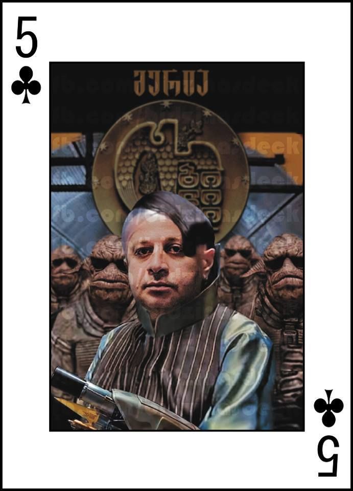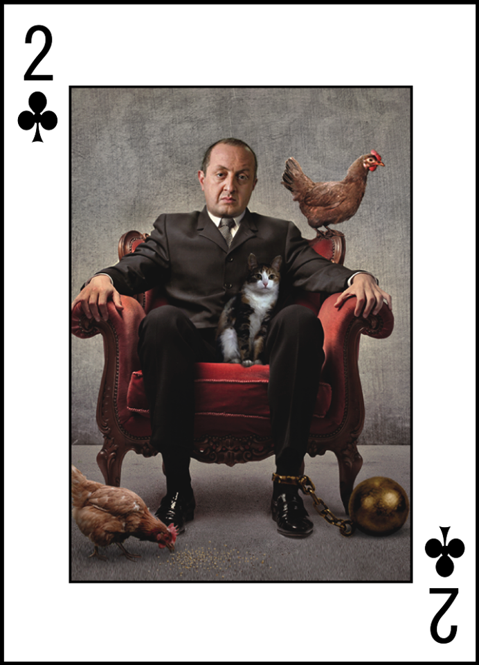 - ამ საკითხზე ვიდრე საბოლოოდ ჩამოვყალიბდებოდით, ბევრი ვიდავეთ. საბოლოოდ, მცირე კენჭისყრის მსგავსი ჩავატარეთ მასტების გამოსავლენად, რამაც შედეგი გამოიღო. თავიდანვე შევჯერდით მთავარზე: არავითარი პირადი ხასიათის მინიშნებები ან სექსუალური ნიშნის ფოტოკოლაჟი - ადამიანის უფლებების დაცვა ჩვენი პრიორიტეტია. ამიტომაც პერსონაჟების ფოტოკოლაჟში ვერ ნახავთ მინიშნებას პირად ცხოვრებაზე - გამონაკლისი მხოლოდ ნათესაური კავშირია. მაგალითად, ექსკლუზიურად გეტყვით, რომ ერთერთი ნახატის მიხედვით მეფეზე, გამოსახულია მამის ყელზე ჩამოკონწიალებული ქალიშვილი - ზრდასრულ ქალიშვილზე ვამბობ, რასაკვირველია. მგონი, ძნელი მისახვედრი არაა, ვინ იქნება ამ კარტზე. ხადურის ხსენებაზე ბევრს გაახსენდება ციკანი, ჰოდა, კარტზეც ციკანია, ზედაც - ჩანგალი პიჯაკის გარე ჯიბეში. რა შეიძლება გაგახსენდეს შიხიაშვილზე - ალბათ, ვირთხა. ჰოდა, ეგეც ადგილზეა...