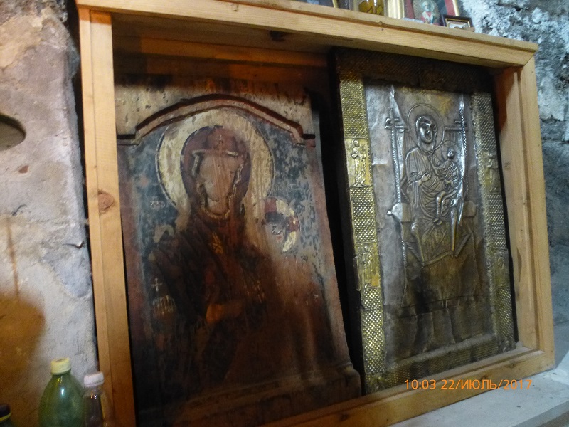 მერე აგვიხსნა: ეს ტაძარი XIII საუკუნეშია მოხატული. აქ წმინდა გიორგის X საუკუნის ჭედური ხატია, რომელიც მეფე გიორგი II-ს შემოუწირავს. კარგად არ ჩანს, მაგრამ, მგონი, ეს ძალიან ძველი, VI თუ VII საუკუნის ხატიც წმინდა გიორგისა უნდა იყოს, ლითონის ნაკეთობაა. კარიც ძველი მოჭედილია. ეკლესიაში წირვა-ლოცვა ტარდება ხოლმე, მაგრამ არა - ყოველ შაბათ-კვირას. მღვდელი გვყავს, მაგრამ სვანი არ არის, გვარად - ბუცხრიკიძეა. ჩვენი მოძღვარი ჭოლაშის ეკლესიაშიც წირავს, ჩვაბიანშიც და აქაც, ამიტომ წირვა-ლოცვასაც მონაცვლეობით ატარებსო.