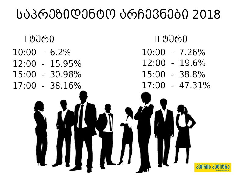 პრეზიდენტის არჩევნების პირველი ტურისათვის ამომრჩეველთა აქტივობა 17:00 საათის მდგომარეობით 38,16 პროცენტი იყო, რაც რაოდენობრივად 1 337 284 ამომრჩეველს შეადგენდა, რაც მნიშვნელოვნად განსხვავდება პირველი ტურის აქტივობისგან. ამის თაობაზე არაერთი მოსაზრება გამოითქმის. ექსპერტ გია ხუხაშვილის აზრით, ამომრჩევლის გააქტიურება რამდენიმე ფაქტორითაა გამოწვეული: გია ხუხაშვილი: "პირველსა და მეორე ტურს შორის აქტივობის სხვაობა შემდეგი სოციალური ჯგუფებით ყალიბდება: