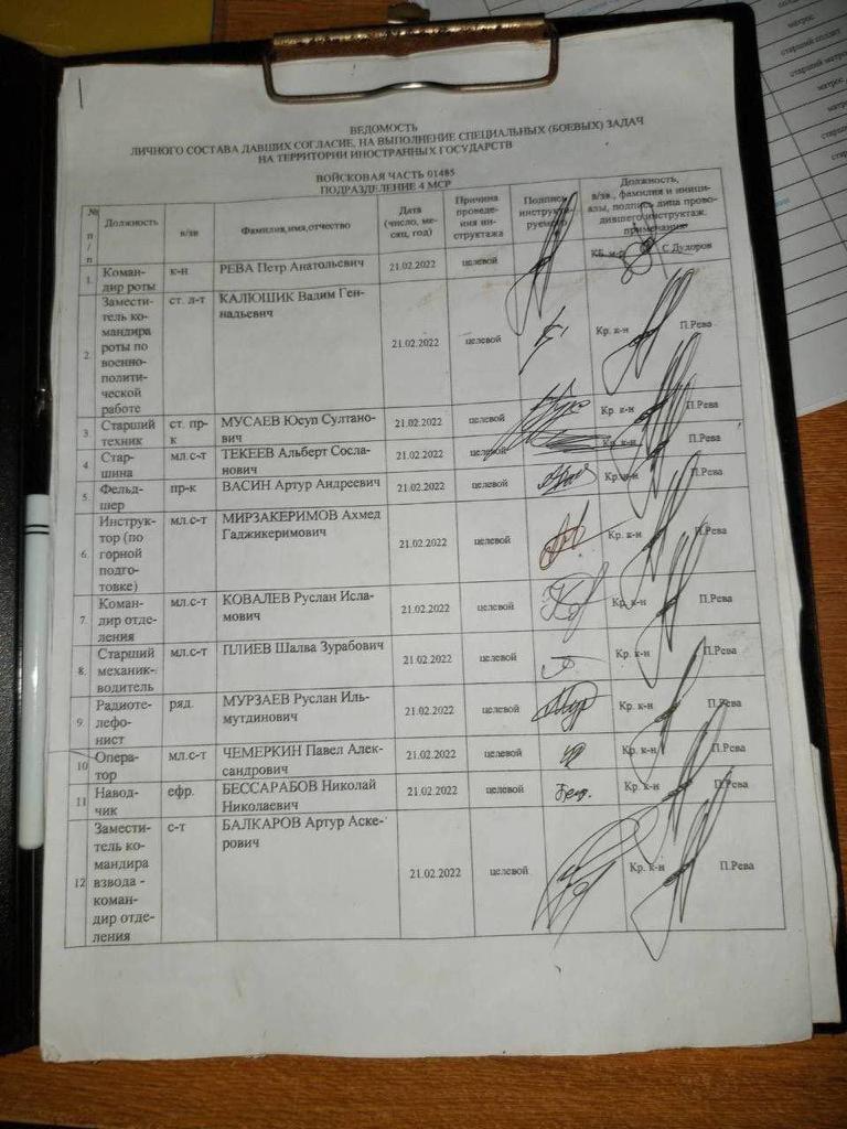 ამ კონკრეტულ უწყისში რუსეთის შეიარაღებული ძალების „სამხედრო ნაწილი-01485“-ის მე-4 მოტომსროლელი ასეულის პირადი შემადგელობის ხელმოწერებია, დაწყებული ასეულის მეთაური - კაპიტნის, ასევე, სამხედრო-პოლიტიკურ ნაწილში მისი მოადგილის (ანუ „ზამპოლიტის") ხელმოწერებით და გაგრძელებული (რომლებიც უწყისის სხვა გვერდებზე იქნება) ასეულის ყველა დანარჩენი წევრის ხელმოწერით.