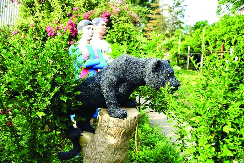 - ორი წლის წინ დაიწყეთ და უკვე მუზეუმს ჰგავს თქვენი ეზო, სადაც არცთუ ცოტა ნამუშევარია. მოგვიყევით, როგორ აკეთებთ თქვენს ფიგურებს. - ჯერ ვამზადებ რკინის კონსტრუქციებს, მერე - კარკასს მავთულით, ფორმა რომ მივცე. სულ ბოლოს ზემოდან ხელოვნურ ბალახს ვაკრავ. ჭრა-კერვაც მიწევს. ცოტა თარგის გამოჭრა და კერვა კი მიჭირს, მაგრამ ამასაც ვერევი. მაგალითად, ფეხბურთელები რომ გავაკეთე, იგივე პრინციპი გამოვიყენე, ოღონდ მათ ხელოვნური ბალახი არ გადავაკარი, წებო-ცემენტით გავაკეთე და მერე საღებავები ვიხმარე. იდეები ბავშვებს მოსდით - უნდათ ანიმაციური გმირები, ეგზოტიკური ცხოველები.