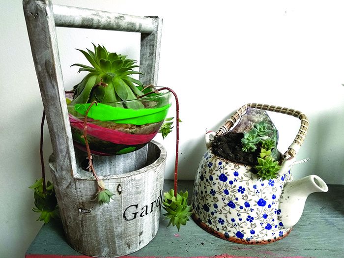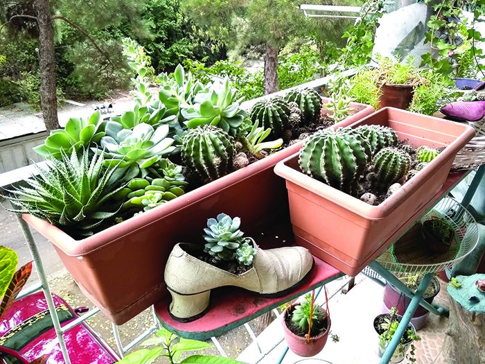 - ვერანდაზე მცენარეები და სიმწვანე კი გამრავლდა, მაგრამ აქ ყველაფერი შენებურად არის გაფორმებული... ყურადღებას იქცევს არაერთი კომპოზიცია, მაგალითად, ფეხსაცმელში ჩარგული სუკულენტები, ან გადატეხილ ჭურჭელში ჩარგული მცენარეები... - აქაც იმავე პრინციპით ვმოქმედებ, ოღონდ - გუმანით. როცა რაიმე ძველდება, ვცდილობ, არ გადავაგდო და გამოვიყენო. ფეხსაცმელი, რომელიც მომწონდა და კარგად გამოვიყენე, არ გადავაგდე და როცა მასში სუკულენტები ჩავრგე, მშვენივრად იყვავილა. მერე უკვე სხვა ფეხსაცმელიც გამოვიტანე... მოკლედ, როცა რაიმე ტყდება, ფუჭდება, არ ვაგდებ, ფორმას ვუძებნი. ეს ახლობელ-მეგობრებმა, მეზობლებმა იციან და ასეთ ნივთებს მჩუქნიან...