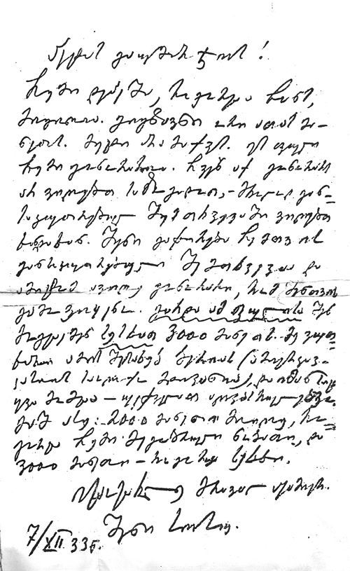 "პეტას გაუმარჯოს! გიგზავნი ორი ათასამდე მანეთს. მეტი არ მაქვს. ეს ფული ჩემი გონორარია. ჩვენ აქ გონორარს არ ვიღებთ საზოგადოდ, მხოლოდ განსაკუთრებულ შემთხვევაში ვიღებთ ხანდახან. შენი გაჭირვება ჩემთვის განსაკუთრებული შემთხვევაა და ამიტომ ავიღე გონორარი, რომ შენთვის გამოვიყენო. გარდა ამისა, შენ მოგცემენ სესხად 3.000 მანეთს, მე ვუთხარი ამის შესახებ ბერიას (ამიერკავკასიის საოლქო მდივანია) და იმანაც სიტყვა მომცა, უეჭველად აღვასრულებო. 2.000 მანეთი მიიღე, როგორც ჩემი მეგობრული ნობათი და 3.000 მანეთი - როგორც სესხი.