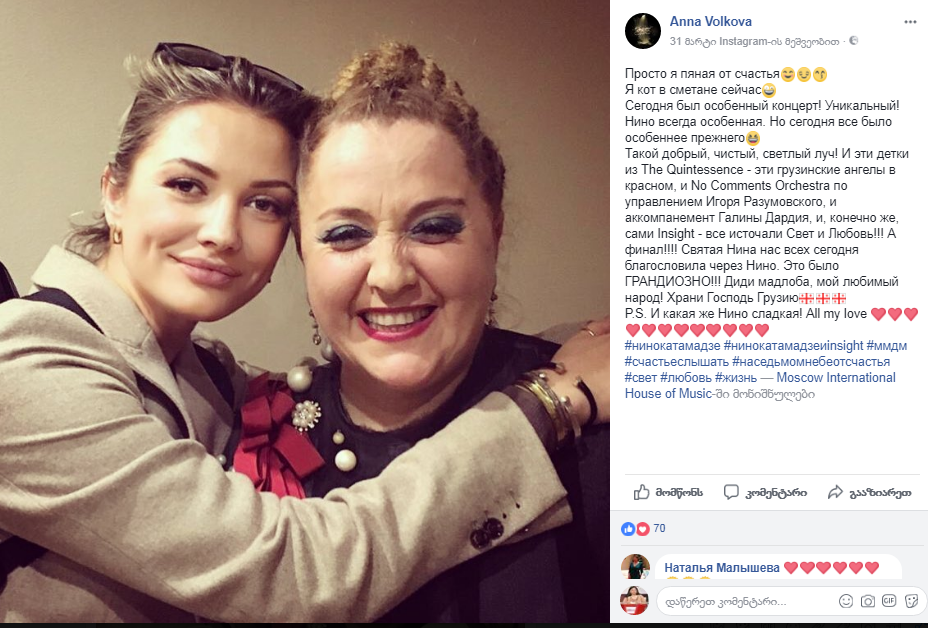 - ძალიანაც კარგი ქნა, თუ არავის დაუგდო ყური და ჩაატარა კონცერტი, მაგრამ ერთი კია: ჩვენ რუსეთში გამართული კონცერტის გამო მოღალატეები გვეძახეს, ნინო ქათამაძეზე ხმას არავინ იღებს, აქედან ჩანს, რომ ვიღაცას ვიღაცის ჯინი სჭირს!.. საქართველო მაგათ არ უყვართ, ვინც ჩვენ ამის გამო გვაკრიტიკებს. მსოფლიო გვეუბნება, გაანებეთ რუსეთს თავიო, ამერიკას ეშინია მათი და ჩვენ რა მოგვივიდა?! მე მასწავლის ვინმე რუსეთი რაც არის?! - გათახსირებული, მაიმუნი ხალხია, თავის უფროსებიანად, მაგრამ ჩვენმა ხალხმა რა დაგვიშავა?! რა მოგვიტანა ომმა და დაპირისპირებამ?! ახლახან, რუსეთის ხანძრის მერე ვიღაც ქალი გამოჩნდა, ქალი კი არა ალქაჯი და რუს ბავშვებზე ამბობს, ყველა რატომ არ ამოწყდნენ, სულ არ უნდა დაიბადონ ეგენიო... ამ დროს ქართველმა ქალმა თავი შესწირა ბავშვების გადასარჩენად იქ ხანძარს. ბავშვია ყველაზე დიდი ღირებულება მსოფლიოში და არ აქვს მნიშვნელობა რა ეროვნებისაა.