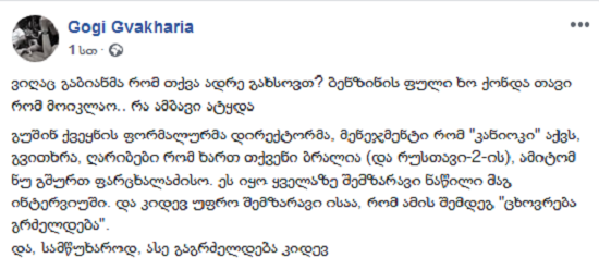 გოგი გვახარია, ხელოვნებათმცოდნე: "ვიღაც გაბიანმა რომ თქვა ადრე გახსოვთ? ბენზინის ფული ხო ქონდა თავი რომ მოიკლაო.. რა ამბავი ატყდა