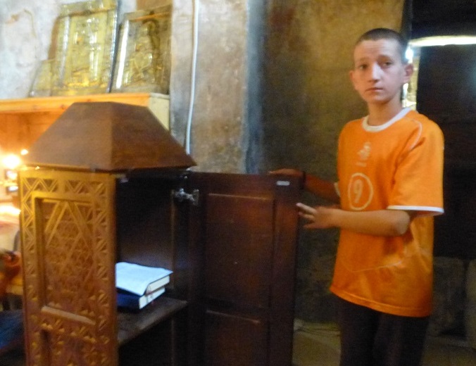 ამ დროს ეზოში პატარა ბიჭმა ურიკა შემოაგორა და ქალბატონმა სწორედ მას სთხოვა გასაღების მოტანა. ვიცოდით, სვანური ტრადიციით, ტაძრის კარი მამაკაცს უნდა გაეღო და რადგან უფროსი მამაკაცები შინ არ იყვნენ, ეკლესიის კარიც ოჯახის უმცროს მამაკაცს დაევალა. ასე გავიცანით მერვეკლასელი გიორგი ქალდანი - იმ გვარისა და ოჯახის შვილი, ვისაც ამ ტაძრის გასაღები აბარია. გიორგი, ფაქტობრივად, ამ ტაძრის სტიქაროსანიცაა და მისი სიწმინდეების მცველიც. ეს პატარა ბიჭი ზრდასრული მამაკაცივით შეგვიძღვა ტაძარში და შესაშური მასპინძლობაც გაგვიწია. მართალია, იმ წუთას სტიქარი არ ეცვა, ზეთი მაინც გვაცხო, ოჯახის ნებართვით კი საკურთხევლიდან ვერცხლის დიდი მედალიონი გამოგვიტანა, ერთ მხარეს წმინდა გიორგის, მეორე მხარეს კი - დედაღვთისმშობლის გამოსახულებით. - ეს ჩვენი სიწმინდეა, ქალდანების წინაპარს ეკეთა. შუაში იხსნება და სვანური ლოცვა წერიაო, - აგვიხსნა და მასთან მიახლების საშუალება ყველას მოგვცა.