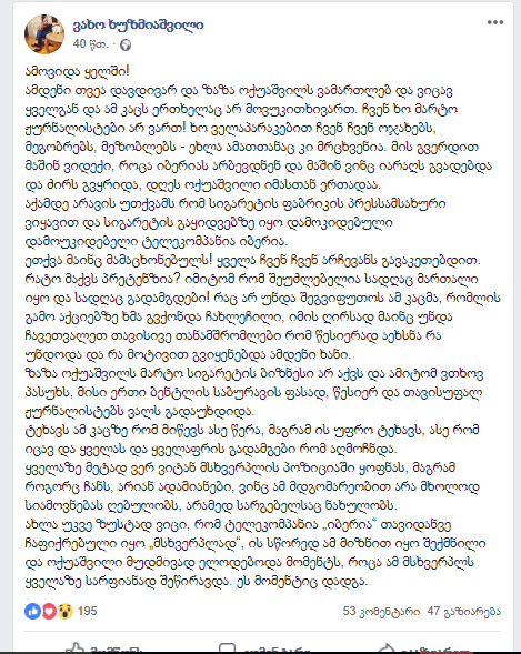 ტელეკომპანია "იბერიას" ერთ-ერთ წამყვანი ჟურნალისტი ვახო ხუზმიაშვილი "ფეისბუკის" პირად გვერდზე საინტერესო პოსტს აქვეყნებს. შეგახსენებთ, ტელევიზიამ მუშაობა კომპანია "ომეგასა" და მის დამფუძნებელ ზაზა ოქუაშვილთან დაკავშირებული სკანდალებს შედეგად შეწყვიტა.